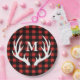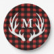 Plaques à papier de plaid rustique de bûcheron avec les andouillers blancs croquants de cerfs communs silhouettant votre lettre de monogramme dans le blanc.