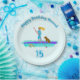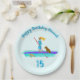 Paddleboard pour fille, assiettes en papier avec personnalisation. La conception de l'embarquement à la palangre est ma propre illustration graphique. Une jeune fille emmène son chien brun pour une balade dans l'eau tropicale pendant qu'une tortue de mer nage à côté. Ajoutez son nom avec "joyeux anniversaire" courbé autour du haut des assiettes. L'âge peut être ajouté sous le design. Les plaques sont de deux tailles.