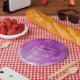 Plum mauve violet moderne art abstrait peint plaques de papier mariage. Texte typographique : Mangez, buvez et célébrez le mariage de puis ajoutez vos propres noms en dessous. Un grand ajout personnalisé à vos buffets mariages ou à vos tables de fête. Autres éléments et couleurs correspondants disponibles dans cette conception. © Original watercolor art and design par Sarah Trett www.sarahtrett.com pour www.mylittleedenweddings.com