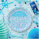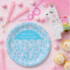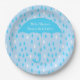 Plaque de papier baby shower bleu, avec des graphiques d'un motif bleu ciel blanc et turquoise et un grand parapluie bleu turquoise. Personnalisez le texte blanc pour lire ce que vous voulez. Les invitations correspondantes et les autres fournitures de fête sont disponibles.