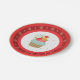 Cette assiette en papier présente un cupcake de vacances avec une décoration étoilée au dessus. La bordure autour de l'assiette est rouge avec des flocons d'or et une bordure en or à l'extérieur.