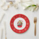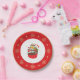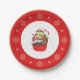 Cette plaque en papier présente un cupcake de vacances avec une décoration sucre de canne sur le dessus. La bordure autour de l'assiette est rouge avec des flocons d'or et une bordure en or à l'extérieur.