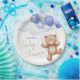 Plaque en papier baby shower décorée d'un adorable ours en peluche à cheval ballons dans les nuages.