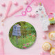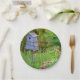 Cette plaque en papier présente une patinée maison d'oiseaux gris au milieu d'un jardin fleuri. Idéal pour les fêtes et les pique-niques !