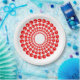 Des perles rouges filetées sur une fine ligne, forment un cercle. Le cercle est répliqué 4 fois de plus dans des cercles de plus en plus petits allant au centre. Le placement du "trou" dans la perle crée une illusion optique d'effet tunnel. Le dos est rouge.