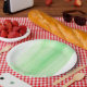 Enjoy mangeant un repas outre de ces plats jetables d'aquarelle vert clair.