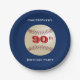 Un base-ball sur un arrière - plan bleu-foncé décore cette plaque à papier unique et d'amusement de partie. Bien que le défaut indique la "quatre-vingt-dixième fête d'anniversaire", vous pouvez facilement changer le nom, # des années, et de l'événement. Un test maison sûr !. Serviettes assorties disponibles à mon magasin de zazzle, SocolikCardShop*. Les fans de base-ball l'aimeront ! Tous droits réservés © Alan 2015 et Marcia Socolik.