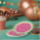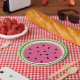 La PASTÈQUE a coupé une pastèque dans la moitié et vous avez un plat de papier intéressant et estival de pique-nique. Articles assortis : "Serviettes de papier", "dessous de verre > liège".