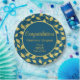 Couleurs de l'école bleue et or, bouchons de graduation or jetés dans l'air pour lui et elle. Belles plaques de papier pour une fête de fin d'études, pour un diplômé d'un lycée, d'un collège ou d'une université aux couleurs de l'école de bleu et d'or. Personnalisez avec l'année de diplôme, le nom du diplômé et le nom de l'école.