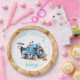 Plaques en papier pour l'anniversaire de la ferme, tracteur et animaux. Plaques rondes avec tracteur bleu et texte bleu personnalisé. Exemple de libellé : "Joyeux anniversaire à (nom)". Une drôle de vache regarde derrière le tracteur, tandis qu'un chiot est assis à proximité. Un petit chat jaune se trouve au-dessus du tracteur, et un oiseau bleu vole au-dessus. Le design est en stratifié et bordée de foin doré brun.