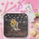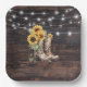 Plaques en papier de Fête des mariées fleurie rustique - avec des bottes en cuir en mauvais état ornées de tournesols jaunes et de verdure sur un arrière - plan rustique en bois de grange avec des lampes à cordes. Les plaques se coordonnent magnifiquement avec d'autres articles de la collection de douche nuptiale.