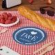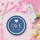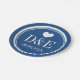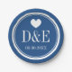 Plaques en papier monogramme bleu marine et blanc pour la fête de mariage. Elégantes petites ou grandes assiettes pour le barbecue, douche nuptiale chic, fiançailles élégante, anniversaire classe, bachelorette amusante etc. Design de typographie classique avec symbole d'amour et bordure circulaire. Personnalisé avec les initiales monogrammées de la mariée et du marié plus la date du mariage. Joli imprimé modèle pour les clients. Fêtes pratiques pour dîner de répétition en plein air, gâteau, Hors d'oeuvre, desserts, etc. Couleur arrière - plan personnalisable.