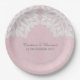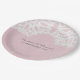 Plaques de papier Mariage en dentelle simple et sophistiquée avec un motif en dentelle blanche sur un arrière - plan en papier vintage en faux rose clair. Ces assiettes classiques et élégantes sont parfaites pour un mariage rustique. Facile à customiser avec vos détails mariages. Cliquez sur "Customiser" pour trouver d'autres options de personnalisation.