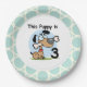 Les plaques de papier du troisième anniversaire de naissance sur le thème de la marionnette comportent un adorable chien de chiot avec un gros os, un texte qui lit This Puppy is 3, et une bordure de cercles géométriques blancs sur un arrière - plan bleu clair. Nous avons les serviettes en papier, T-shirts et costumes de caisse assortis, dessus-gâteaux, sacs fourre-tout, étiquettes de adresse, cartes postales, bibs, mugs, et plus encore!