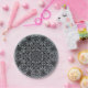 Plaques de fête en papier avec l'image d'un mandala noir contre un arrière - plan en argent glittery.