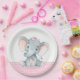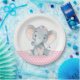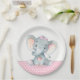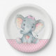 Joli baby shower d'éléphant bébé plaques en papier avec adorable petit éléphant portant une jolie arc rose sur un arrière - plan pois rose et gris. Vous pouvez ajouter du texte pour personnaliser ces douces plaques en papier baby shower d'éléphant pour filles.