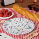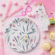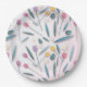 Belles plaques de papier à ressort avec tulipes colorées, marguerites et arrière - plan blanc avec des marquages turquoises. Voir magasin pour faire correspondre la vaisselle à thème.