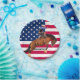 Un cavalier et un cavalier prennent un peu d'air au-dessus d'un drapeau américain lors d'une compétition d'équitation de taureaux.