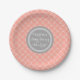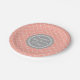 Nom personnalisable c'est des plats d'une partie de baby shower de fille dans l'amusement et le motif marocain de rose de pêche chic, gris et blanc orange de quatrefoil de trellis.