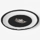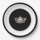 Plaque de papier de fête illustrée dans un jeu de couleurs mixte noir et blanc avec une couronne argentée au centre.