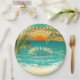 Des palmiers et des lampes à cordes encadrent le coucher du soleil sur l'océan et le rivage de sable sur ce thème de mariage sur la plage. Customisez le texte moderne et élégant avec vos informations de mariage.