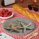 Plats tropicaux de noce de plage avec l'image renversante de deux étoiles de mer sur le sable représentant les jeunes mariés avec le texte que vous pouvez customiser et personnaliser. Un regard naturel avec l'océan et la vie marine conçus comme plaque à papier de thème de plage que vous pouvez utiliser pour amuser et servir vos invités de partie dans le style.