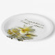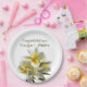 Plaques papier plumeria wedding shower ou fiançailles. Les plaques rondes ont une ligne de texte pour les noms et / ou félicitations. Les plaques jaune pâle ont une grande image de fleur. Frangipani blanc, ou plumeria, les fleurs ont des centres jaunes dorés combinés avec des bourgeons, dans ce design floral assez réaliste. Utilisez pour un wedding shower décontracté, un dîner de répétition ou une fête de fiançailles.