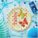 Un design des années 70 avec des papillons stylisés sur un arrière - plan à pois de polka. Personnalisez avec votre nom. Dans les couleurs rétro des années 70, orange, vert, jaune et bleu.