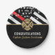 Cette plaque en papier est ornée d'un drapeau de pompier à rayures noires et blanches, ainsi que d'une mince bande rouge. "Félicitations" et l'insigne d'un pompier se trouve au-dessus du nom du pompier, lieutenant ou chef qui est diplômé ou qui prend sa retraite. Fêtez dans le style !