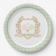 Mettez la scène avec ces belles plaques de fête d'anniversaire de pickleball personnalisé. Cette conception a une aquarelle image d'une crête entourée de branches avec des pagaies vertes et roses en vichy pickleball au centre. Il y a une bordure en vichy verte autour du bord. Le texte dit "Joyeux anniversaire." Les couleurs utilisées comprennent le vert mousse, le rose roux et le bronzage.