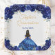 Cette plaque d'anniversaire élégante et glamour de Quinceañera présente une belle princesse aux cheveux foncés dans une robe bleue foncée. Le texte combine écriture manuscrite et polices sans serif modernes pour un look élégant et sophistiqué. Les arrangements floraux et les confettis dorés créent un mélange parfait de rustique et de chic. Graphiques par www.etsy.com/uk/shop/SunflowerDayLove