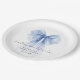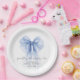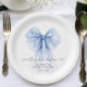 Assiettes en papier élégantes pour sa douche de mariée avec un ruban coquet bleu aquarelle, "quelque chose de bleu avant de me marier" dans un script calligraphié chic, et le nom de la mariée et la date de la douche dans une typographie moderne simple.