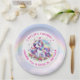 A sweet unicorn themed birthday party personalized paper plates for a little girl. Purple, pink and rainbow design sparkles and hearts.