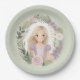 Ce joli design présente une illustration fantaisiste de Rapunzel entourée de fleurs vert pâle et violet.