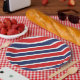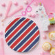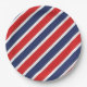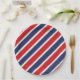 L'assiette en papier de fête est présentée dans un imprimé de rayures rouges, blanches et bleues patriotiques.
