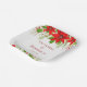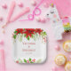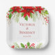 Cette plaque en papier carré rouge de Noël festif présente une belle aquarelle de fleurs de poinsettia rouges et de feuilles de pin pour une réception de vacances. Superbe décoration de mariage d'hiver avec une bordure botanique.