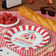 Venez un, venez tous ! Complétez votre décor à la plus grande fête d'anniversaire sous le grand toit avec nos modèles de plaques de carnaval de cirque. Ce billet de cirque carnaval plaques de fête d'anniversaire comporte une tente rouge et turquoise avec un grand arrière - plan de chapiteau rouge sur une assiette de fête.