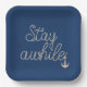 Stay Awhile texte dans la conception de corde avec ancre nautique en bois sur arrière - plan bleu. La couleur Arrière - plan peut être modifiée.
