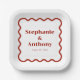 Servez vos invités mariages dans le style vintage avec cette plaque en papier rouge foncé Wavy Edge rétro des années 1950. Doté d'un arrière - plan blanc immaculé encadré d'une audacieuse bordure ondulée rouge foncé, ce design saisit le charme intemporel des années 1950. Les noms de la mariée et du marié ainsi que la date du mariage sont élégamment affichés dans une police de caractères rouge foncé, ajoutant un détail personnel et sophistiqué. Parfaites pour les réceptions de mariage, les douches nuptiales ou les fêtes de fiançailles, ces assiettes d'inspiration rétro apportent style et commodité à votre célébration spéciale.