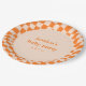 These personalized paper plates feature a bold retro checker pattern in warm orange tones with a soft peach center and custom baby shower text. A playful yet stylish choice for serving cake, desserts, or light bites, they add a coordinated look to baby shower tables and dessert displays. The groovy abstract design brings a fun, nostalgic feel while still feeling polished and party-ready. Personalize the name and date to match your baby shower theme and coordinating decor.