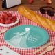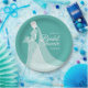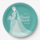 Une assiette en papier pour la douche de la mariée chic avec une mariée portant une robe de mariée en dentelle élégante sur un fond turquoise avec un texte blanc en belle écriture pour les détails spéciaux de votre douche de mariée.