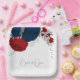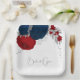 Fleurs romantiques rouge foncé et bleu marine avec plaque en papier mariage feuille argent.