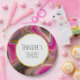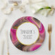 Plaques en papier baby shower au design abstrait super. Les couleurs rose et noire se mélangent et se mélangent dans un mouvement tourbillonnant. Saupoudrer de parties scintillant en faux or entre les couches. Un cadre en cercle blanc avec une fausse bordure en feuille d'or, superposé avec votre texte personnalisé à l'intérieur.