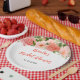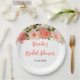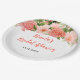 Cette assiette magnifique et élégante présente des roses corail roses rouges et du feuillage à l'aquarelle. Le texte combine une écriture manuscrite et des polices serif pour un look stylé et moderne. C'est parfait pour une fête de mariage rustique de printemps ou d'été.