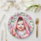 Plaques en papier baby shower pour fille mignonne. Bébé adorable aux cheveux noirs et aux yeux bleus souriant sous une couverture rose. Arrière - plan de roses roses et de feuillage vert.