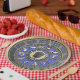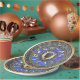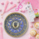 Ensemble de huit plaques de papier de 9 po avec une image d'une roue en zodiaque bleu et or. Voir la boîte à bonbons assorties, tasse, carreaux de céramique carré et dessous de verre. Voir la collection Gemstones & Medallions Plate dans la section HOME.