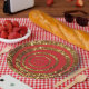 Assiettes En Carton Rouge et plats de point de remous et de polka de