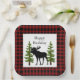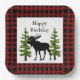 Cette assiette en papier à motif à carreaux rouge et noir rustique présente un orignal et deux sapins. Il y a un message Joyeux Anniversaire que vous pouvez conserver ou modifier pour ajouter votre propre texte.