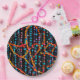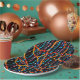 An abstract design of colorful beaded strings covers this round paper plate.