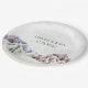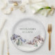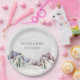 An elegant custom paper plate for your rustic winter wedding or bridal shower with a snow covered country mountain scene.